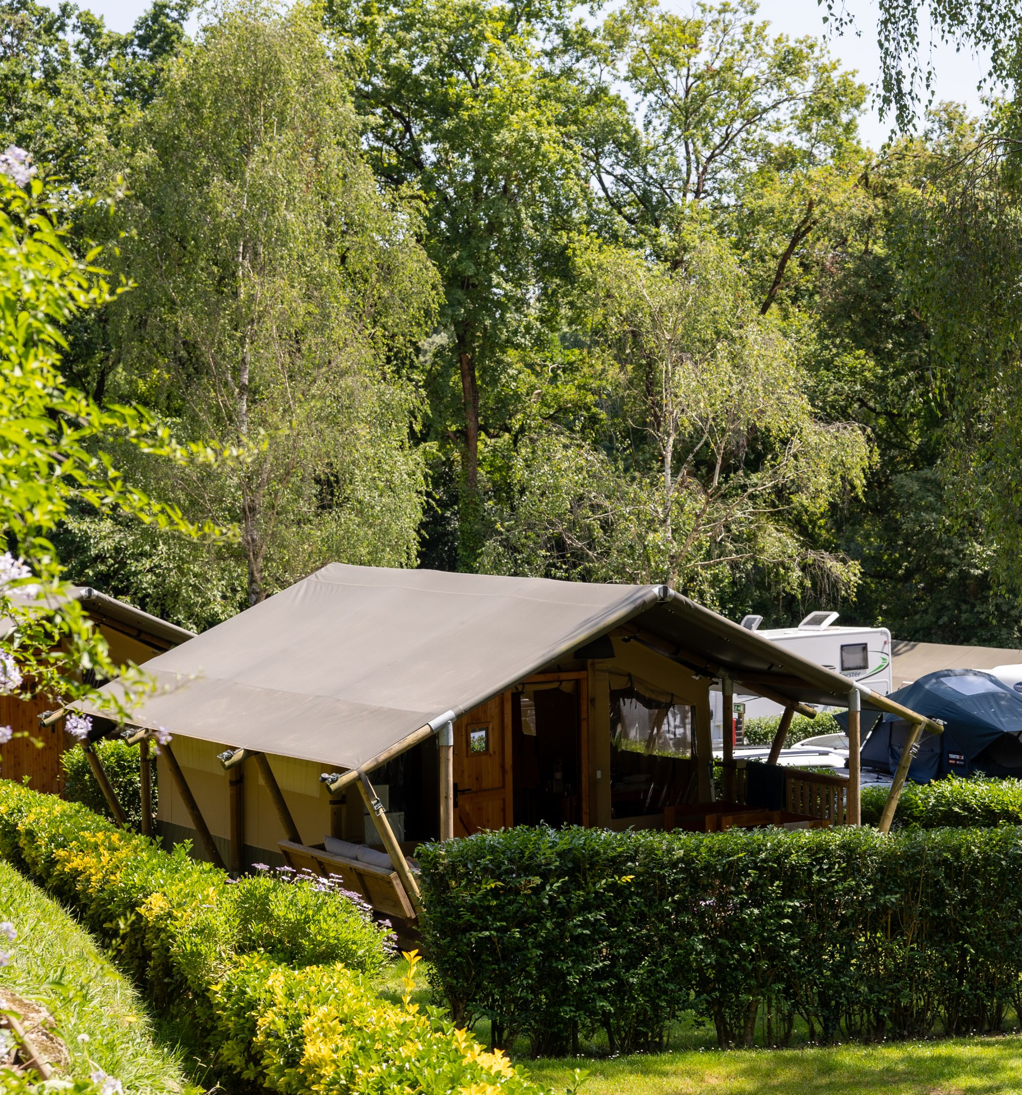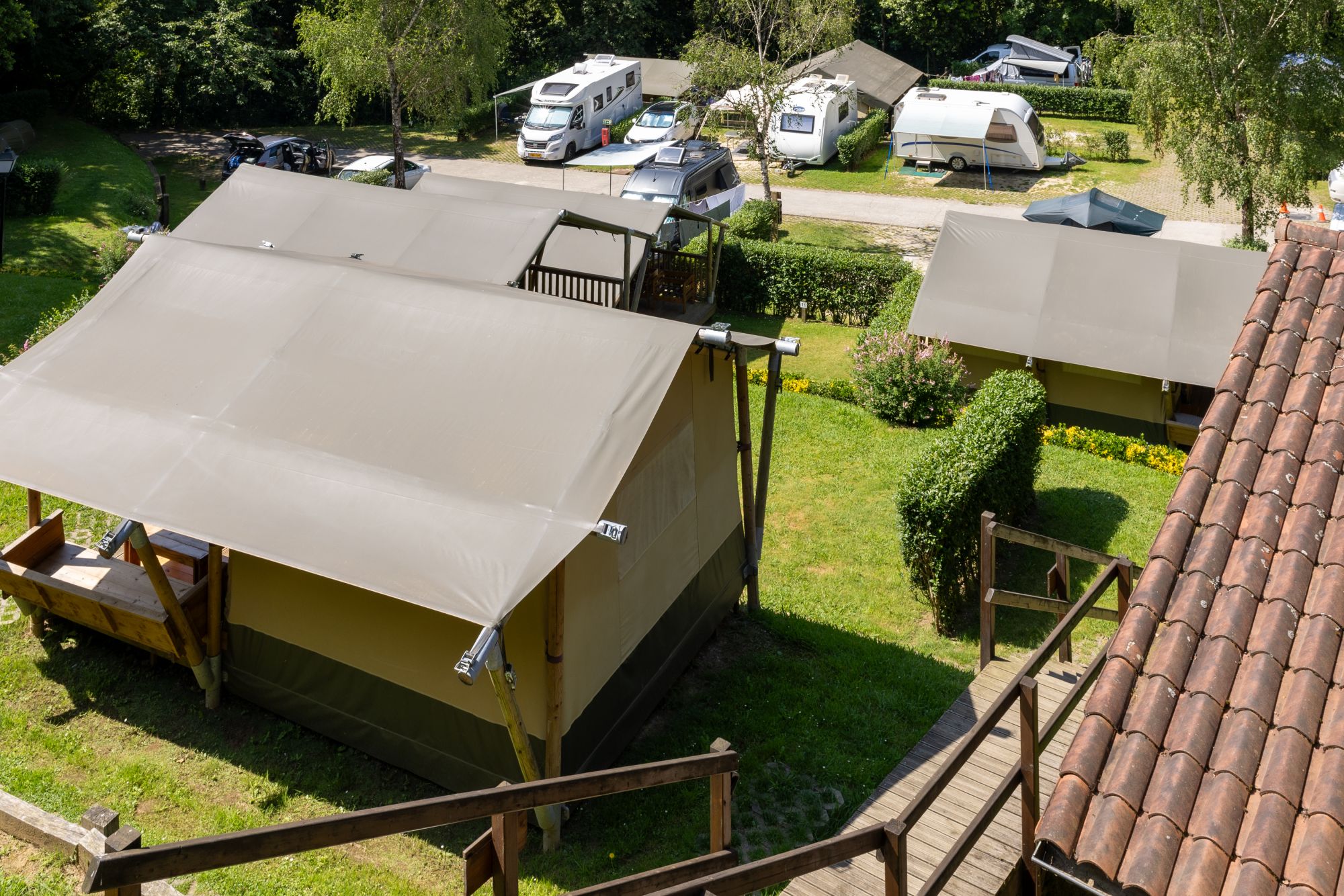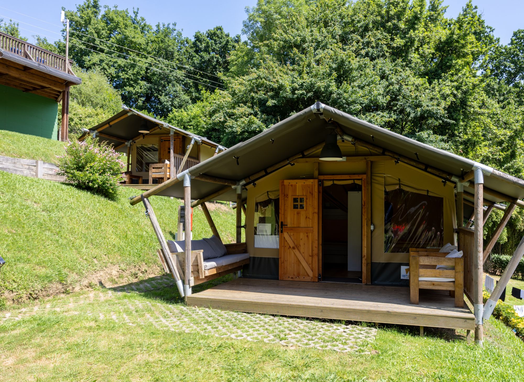 It includes a small kitchen with a dining area and furnished terrace, perfect for preparing simple meals and enjoying the outdoors. It does not have running water or its own bathroom, allowing for a more authentic camping experience, while bathrooms and showers are located just a few meters from the glamping sites.